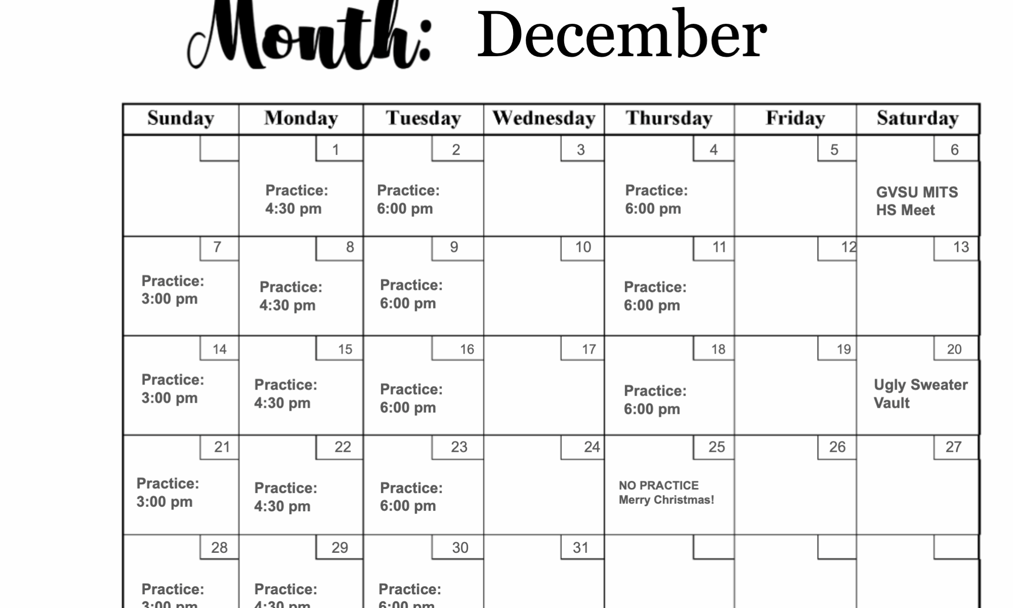 Practice Days for Month of December